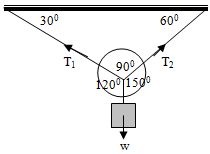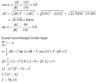 Pada sistem keseimbangan benda tegar seperti pada gambar di atas, batang homogen AB dengan panjang 120 cm memiliki berat 20 N. Beban seberat 25 N digantung pada ujung B dan dihubungkan dengan tali pada dinding. Tentukan tegangan pada tali jika panjang tali 150 cm!