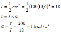 4. Sebuah roda berbentuk cakram homogen dengan jari-jari 60 cm dan massa 100 kg. Jika momen gaya yang bekerja pada roda 200 Nm, hitunglah percepatan sudut roda tersebut!